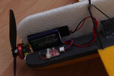 Die Flugzeit liegt somit bei einem ~500mAh 2S um die 5 Minuten. Empfehlen würde ich einen etwa 800mAh Lipo.