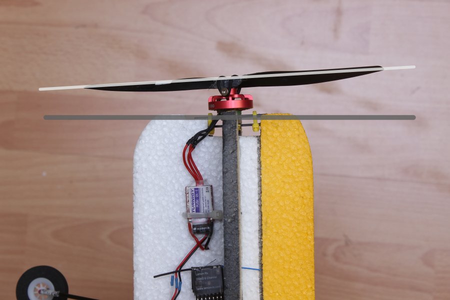 Rechtes Bild: Motorzug/Seitenzug, da ich einen linksdrehenden Propeller (von vorne betrachtet im Uhrzeigersinn) verwende (üblicher ist wohl Rechtsdrehend) muss der Motor um ein paar Grad nach links geneigt werden. Bei Verwendung eines rechtsdrehenden Propellers natürlich entsprechend nach rechts neigen.