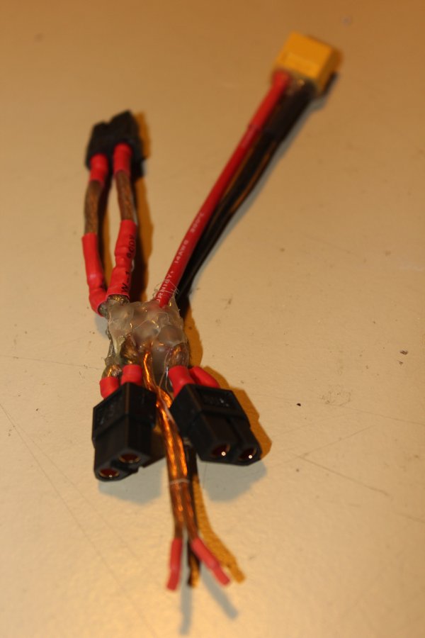 Hier die erwähnten XT60 Buchsen, mit kurzen Kabelstücken zusammengelötet auf eine doppelseitige Kupferplatine und kruzschlussgeschützt durch ordentlich viel Heißkleber. Das längere Silikonkabel mit dem gelben XT60 Stecker ragt dann nachher an der Seite aus den Centerplates raus, da kommt dann der Lipo dran.