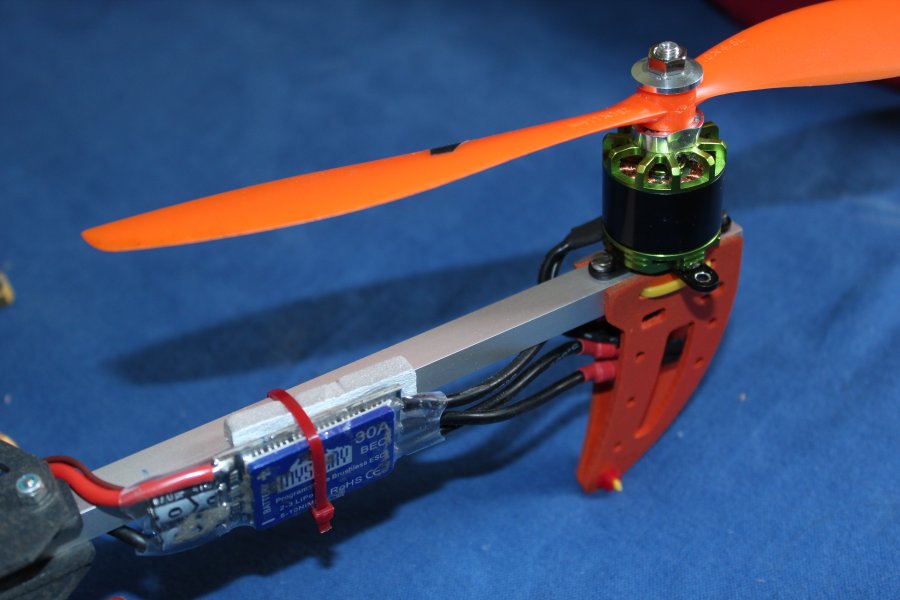 Die Motoren sind direkt auf die Arme geschraubt. Die ESCs werden auch nur durch einen Kabelbinder gehalten, einfacher gings nicht.