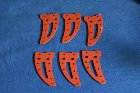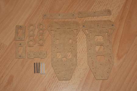 Hier die gefrästen Teile. Beide Centerplates, zwei seitliche Reinsteckverstärkungen und eine in der Front, die auch als Auflage für die Frontarme dient. Die restlichen Teile dienen wie auch beim Tricopter 2 als Abstandshalter und Auflage für die Aluprofile.