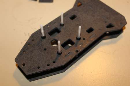 Zu den Centerplates: Wiedermal Hartfaserplatte in 2,5mm Stärke. Insgesamt drei vertikale steckbare Verstärkungen. Der Zwischenraum für Kabel etc. beträgt lediglich 14mm. Obwohl eh schon 10" Props auf die 980KV Motoren kommen sollte der rest so klein wie möglich werden. So wurde die Centerplate 80mm breit und 150mm lang, die vorderen Props drehen also bis kurz vor der Centerplate.