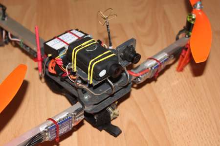 Das Ganze ist auf eine kleine Holzplatte (die zu Beginn erwähnte fpv_plate.dxf) geziptied. Die Holzplatte (bestehend aus zwei zusammengeklebten Platten), in der Die FH18C Kamera Steckt ist mit zwei 1,5mm Messingdräten mit der FPV_Plate verbunden, wodurch die Kamera etwas geneigt werden kann.
