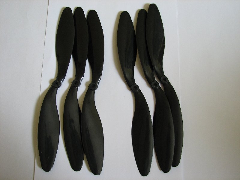 Propeller gleich 2 Sets, damit genug Ersatz da ist; er wird bestimmt mehr als nur einmal abstürzen. Bei den Propellern wird bei drei Motoren einer gegen den Urzeigersinn drehen, da sich der Copter sonst aufgrund des Drehmoments zu sehr um die eigene Achse drehen würde.