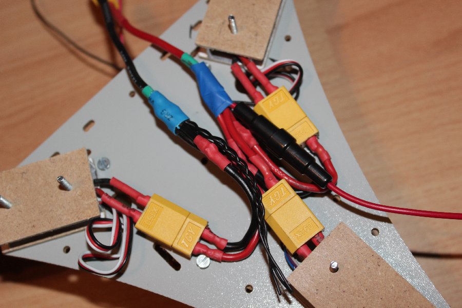 Die 12V hab ich direkt von dem Stromverteiler abgegriffen. Als Sicherung ist eine Handelsübliche 1,6 A Schmelzsicherung verbaut. Falls sich im Flug aus irgendeinem Grund die LEDs kurzschließen soll nur die Beleuchtung ausfallen und der Copter trotzdem in der Luft bleiben. Sicher ist sicher.