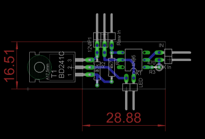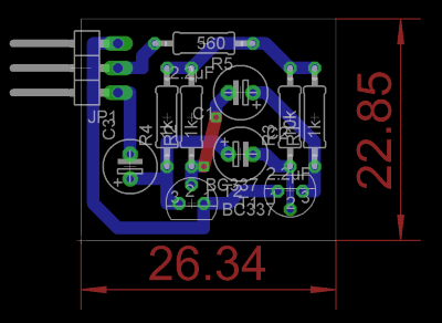 Schaltplan und Board. Das Ganze sollte möglichst klein werden, damit es zwischen die beiden Centerplates passt. Anstelle der Stiftleisten werde ich die Kabel direkt an die Platine löten. Zudem wird der Transistor (T1) wie im nachfolgenden Bild zu sehen über die Platine gebogen.