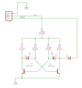 astabile Kippstufe mit zwei Transistoren, zwei Elkos und ein paar Widerständen gebaut.