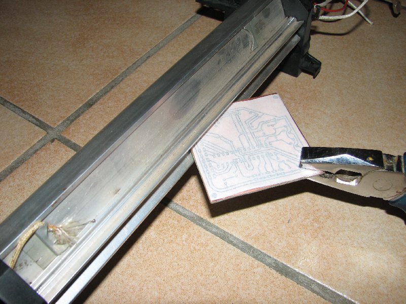 Auf eine beschichtete Folie laserdrucken und per Tonertransferverfahren mit einem gemoddeten Laminator auf eine Kupferplatine "kopieren".