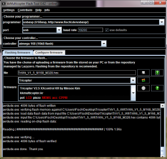 Die Firmware hab ich dann mit dem USBasp Programmer auf den Atmega 168 gebrannt. Die Firmware gibt es auf der kkMulticopter Seite, auch eine Optimierte für das Wii MP.