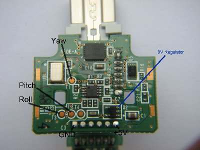 Für Roll, Pitch und Yaw lötet man einfach drei der vorhandenen Pads an, GND und die 5V Spannung legt man an die äußeren Pins der unteren Lötkontakte.