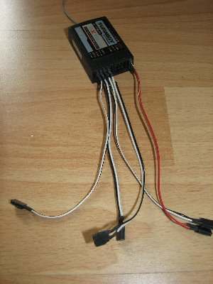 Was solls, hab ich mir halt Adapterkabel gelötet. An den Stecker direkt neben den Potis kommt die 5V Spannungsversorgung. Dabei habe ich im Nachhinein nur ein BEC (die ESC's haben jeweils ein internes BEC) mit dem Controllerboard verbunden, also die Roten +5V Leitungen der anderen zwei gekappt und nur Masse, sowie Signal verbunden. Ich entschied mich dazu, da ich in diversen Foren von Problemen in diesem Zusammenhang gelesen hab.