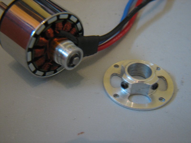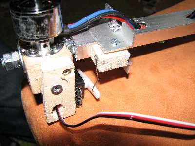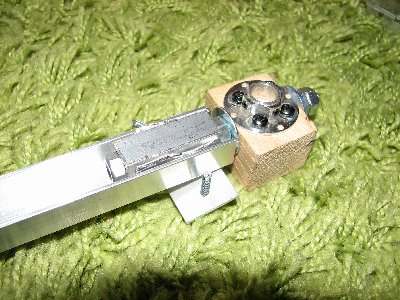 Zuerst der hintere Arm mit dem schwenkbaren Motor. Diesen hab ich auf einen Holzklotz mit einem 6mm Loch in der Mitte geschraubt.