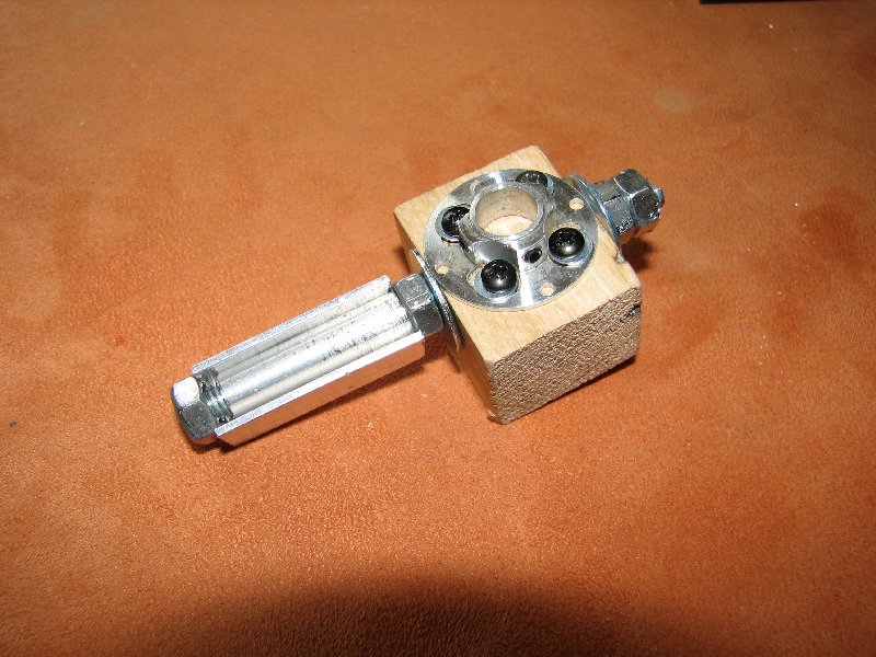 Dieser Holzklotz wird dann auf eine M6 Gewindestange gesteck und wie zu sehen durch ein kurzes Stück Alurohr mit einem Quadratischen U-Profil gesteckt und festgeschraubt, sodass sich der Holzklotz noch gut drehen lässt.