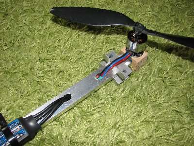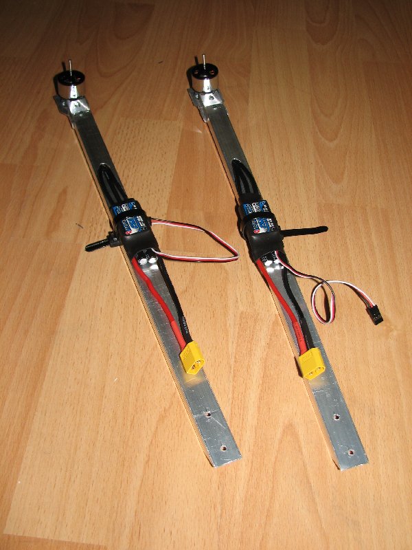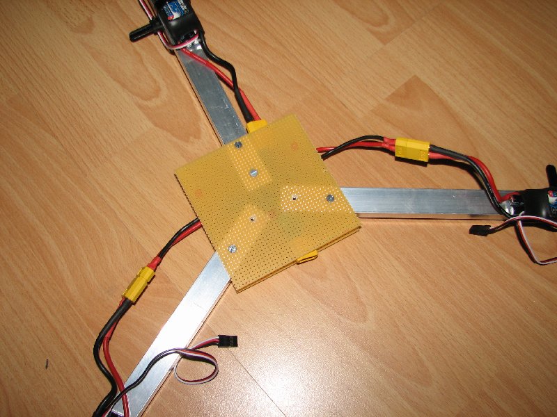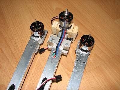 Die Arme hab ich aus Alu Rechteck (1cm x 2cm) U-Profilen mit 40cm länge gefertigt. Die Motoren werden auf kleine Aluplättchen geschraubt und unter die Aluprofile befestigt.