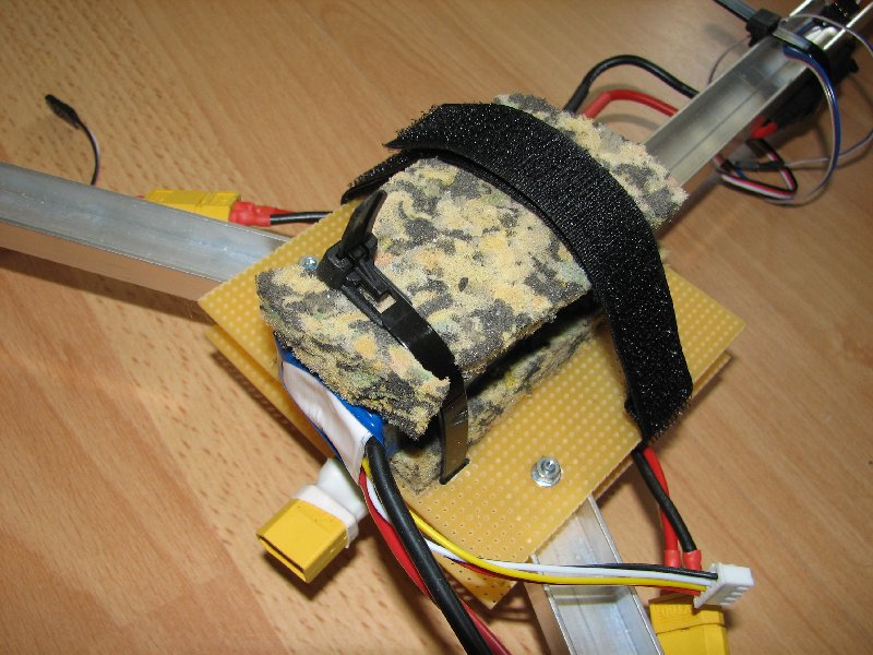 Unter die Centerplate kommt wie gesagt der Energielieferant in Form eines Lithium-Polymer Akkus. Da dieser sehr druckempfindlich ist hab ich ihn mit zwei Stoffpolstern eingedeckt und sanft mit wiederverschließbaren Kabelbindern und Klettband befestigt. (Ich weiß, es sieht wunderschön aus)