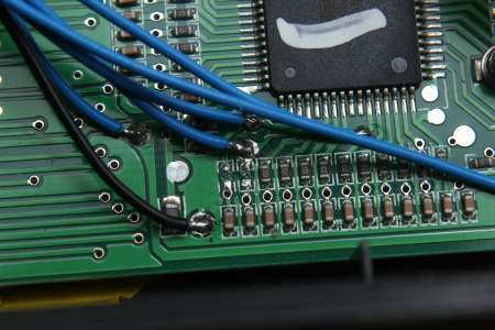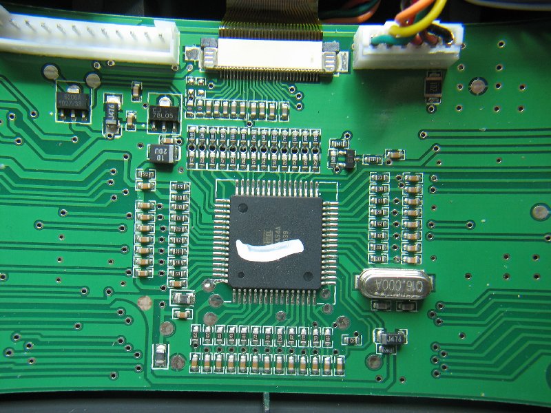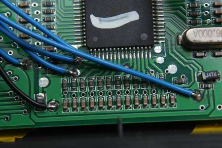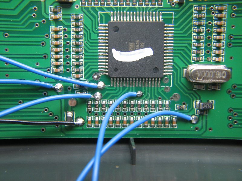 Hierbei kommt man also nicht darum herum, die zwei Schalter auf andere Pins des Atmega zu verlegen. Es gibt an dieser Stelle zwei Möglichkeiten: Entweder man trennt zwei Leiterbahnen auf und lötet zwei dünne Kabel dahinter, oder (wofür ich mich entschieden hab) man lötet zwei SMD Widerstände aus und verlegt zwei Kabel mit entsprechenden Ersatzwiderständen (ca. 220 Ohm) zur anderen Seite des Mikrocontrollers. Hier die Anleitung, der ich gefolgt bin. Dort sind beide Wege beschrieben.