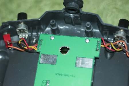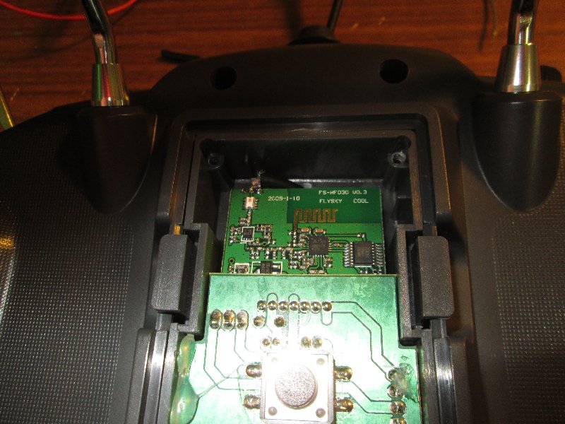 Von der Turnigy 9x (oder wie sie sonst noch heißt) gibt es verschiedene Ausführungen. Bei meiner war die Antenne fest am Gehäuse angebracht und über ein dünnes Koaxialkabel mit dem Sendemodul auf der Rückseite verbunden.