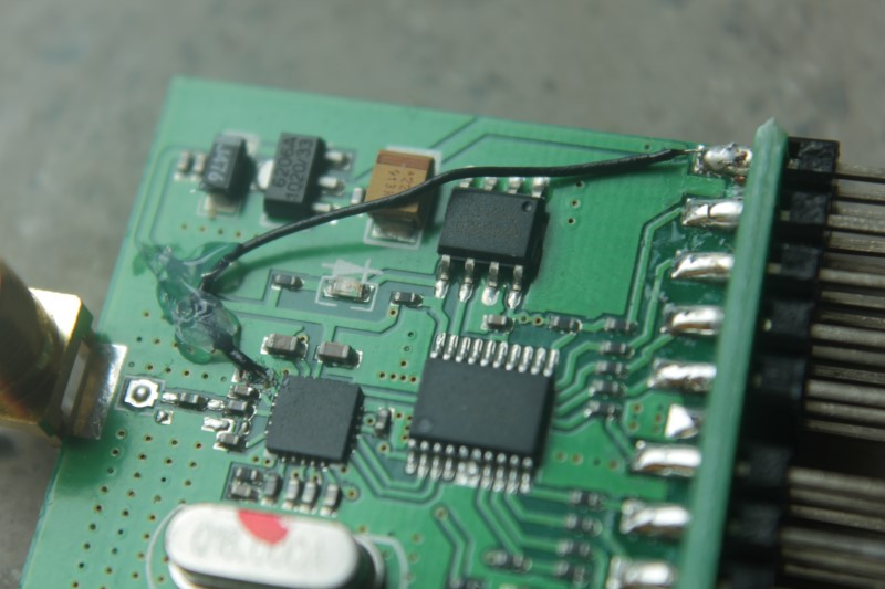 Auf der Rückseite muss von dem Pegelwandler IC das Signal an den zweiten Pin der Buchsenleiste gelegt werden. Dazu nimmt man einen dünnen Kupferlackdraht und lötet ihn vorsichtig an das dritte Beinchen von oben (siehe Bild) und auf der anderen Seite an den zweiten Pin der Buchsenleiste (an dem, wo in der Funke der Widerstand hägt; Die Anleitungen im Netz unterscheiden sich hier Teilweise!).