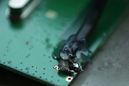 Das RG174 Koaxialkabel ist diesmal auf der unterseide der Platine angelötet und mit etwas Heißklebe Fixiert.