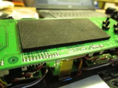 Auseinanderschrauben, Platine nach hinten biegen, alten Schaumstoff abziehen (klebte sehr gut), ...