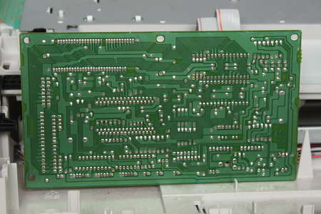 The 5V is taken from a capacitor. For sensing the hammer action a wire (white) is soldered to pin 6 and 7 of the M54587P Darlighton Array IC.