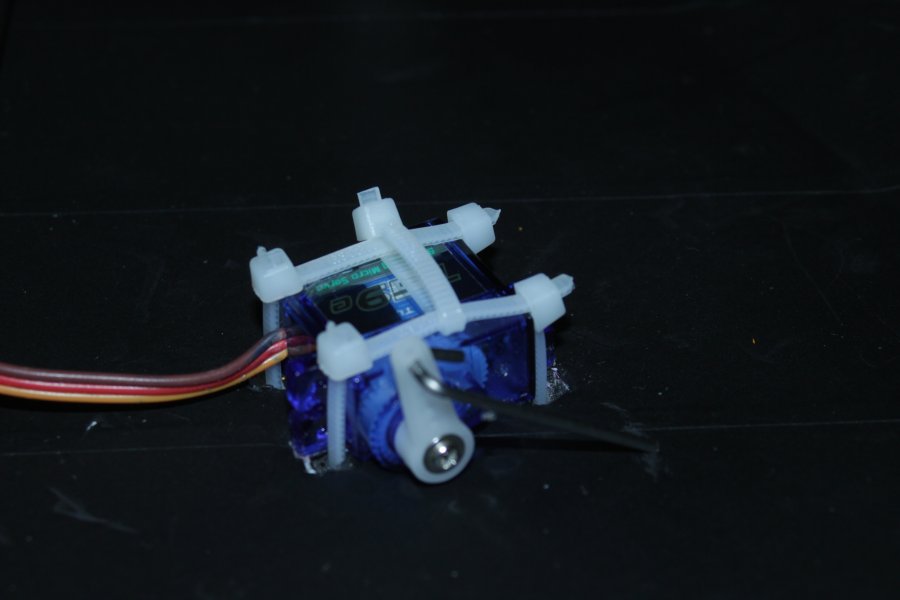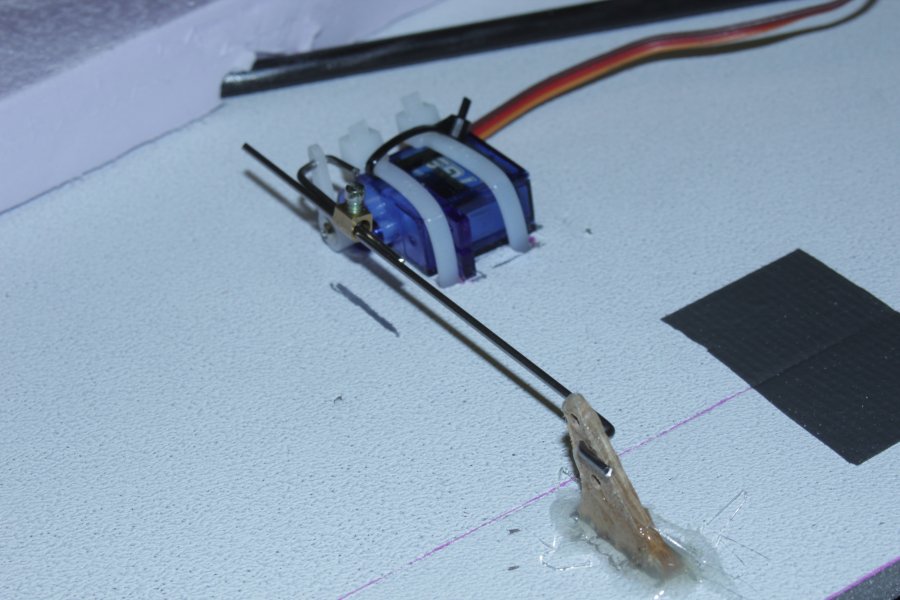 Daher sind die Servos auf der oberen Seite mit Kabelbinder befestigt. Unten musste eine kleine Holzplatte hin, damit die Kabelbinder nicht einfach nur das Saarpor durchschneiden.