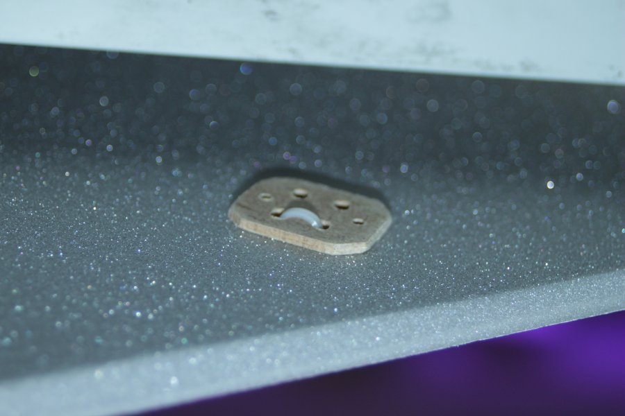 Daher wird er in das Domodur eingelassen und ragt nurnoch ein paar mm oben raus. Um die Kabel zum ESC zu führen musste ich einen kleinen Kanal einfräsen. Dazu einen alten abgebrochenen 3er Bohrer in den Dremel der CNC gespannt. Das Domodur konnte ich dann per Hand parallel zum Fräser bewegen und so etwa 1cm wegfräsen.