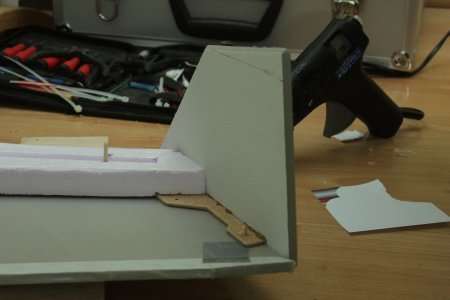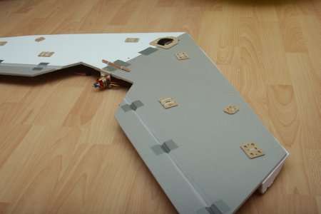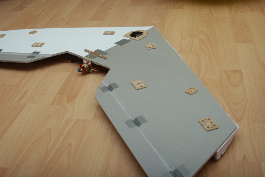 Die Elevons halten mit ein wenig Panzertape wunderbar. Zudem wird der ganze Flieger nachher eh komplett "eingepackt".