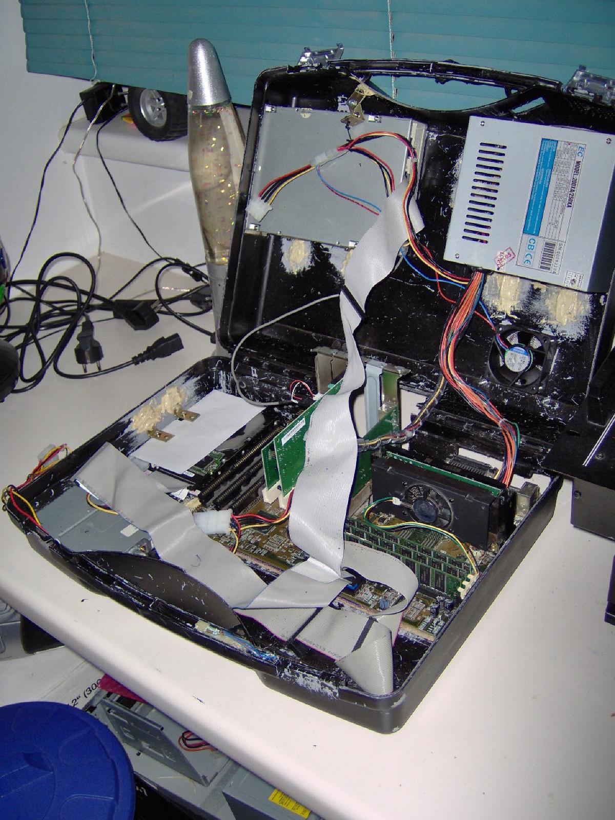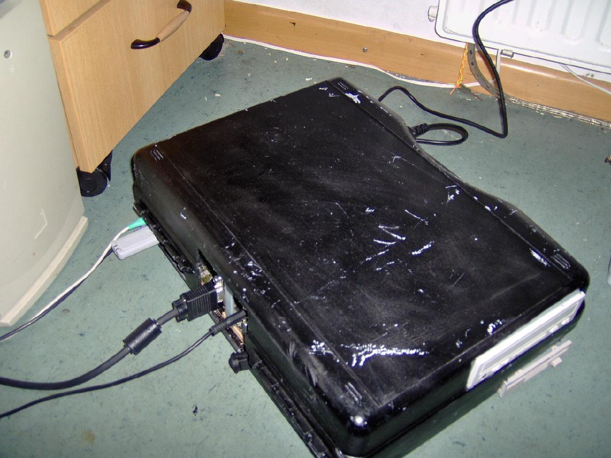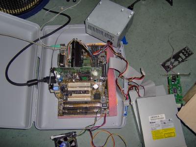 Später hab ich eine 40 gb Festplatte noch kopfüber neben das Motherbaord eingebaut und und das Bertiebssystem installiert. So siehts von innen aus: