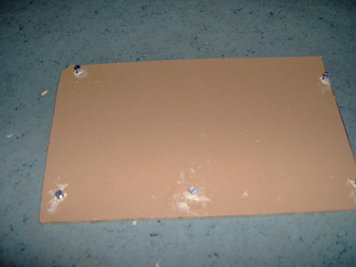 Danach hab ich eine übrige Holzplatte genommen (so groß wie das Motherboard) und an den Stellen für die Schrauben Löcher gebohrt (bis zur Hälfte) und dort eine Mutter reingeklebt (mit Montagekleber), sodass man in der Holzplatte ein Gewinde hat: