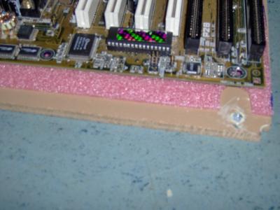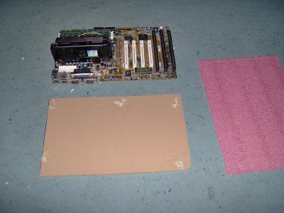 Hier sieht man das Motherboard, die Holzplatte mit den Muttern wo das Motherboard dran befestigt wird und eine weiche kunststoff Matte, die zwischen dem Motherboard und der Holzplatte die Kontakte des Motherboard´s schützen wird: