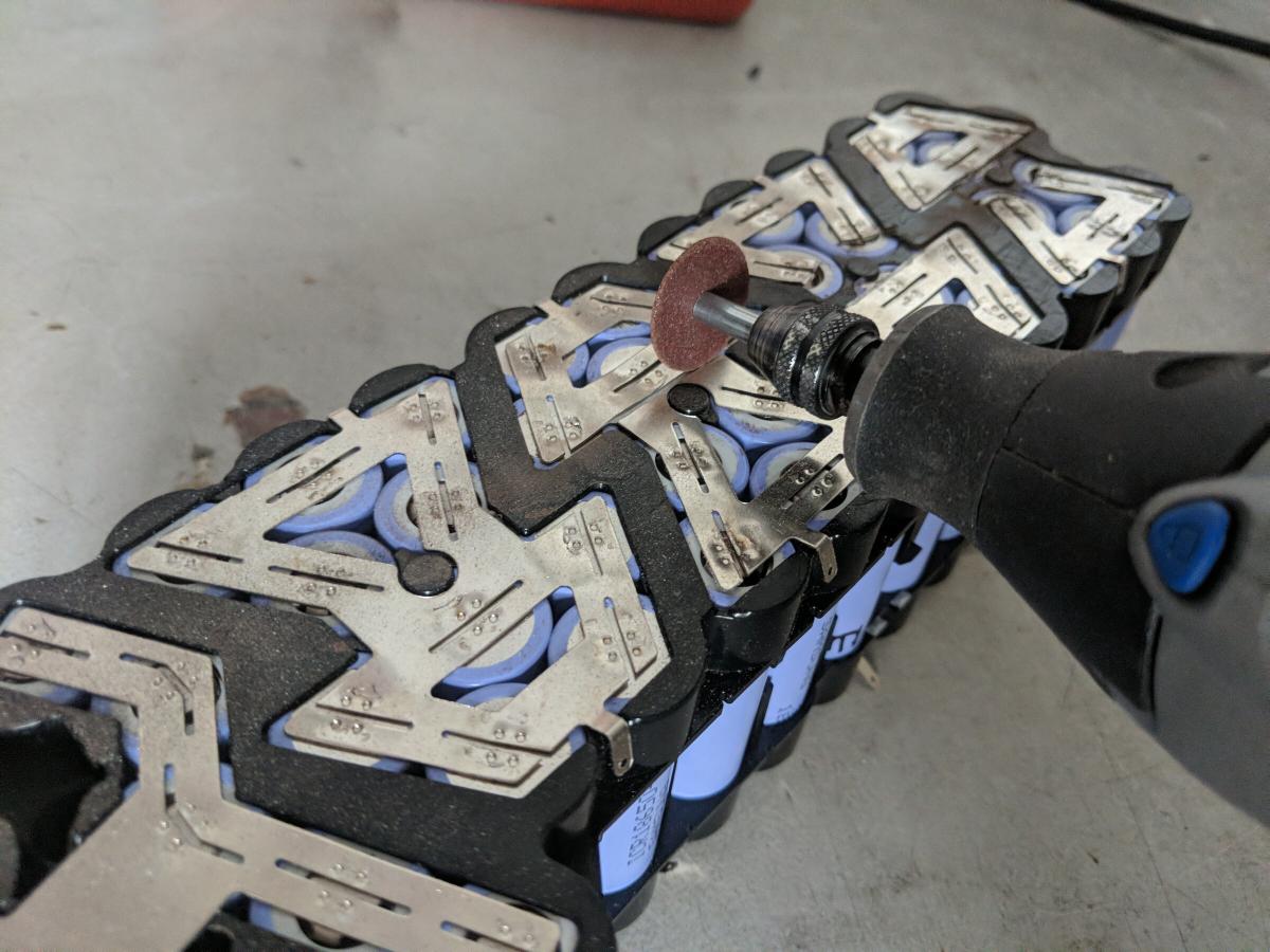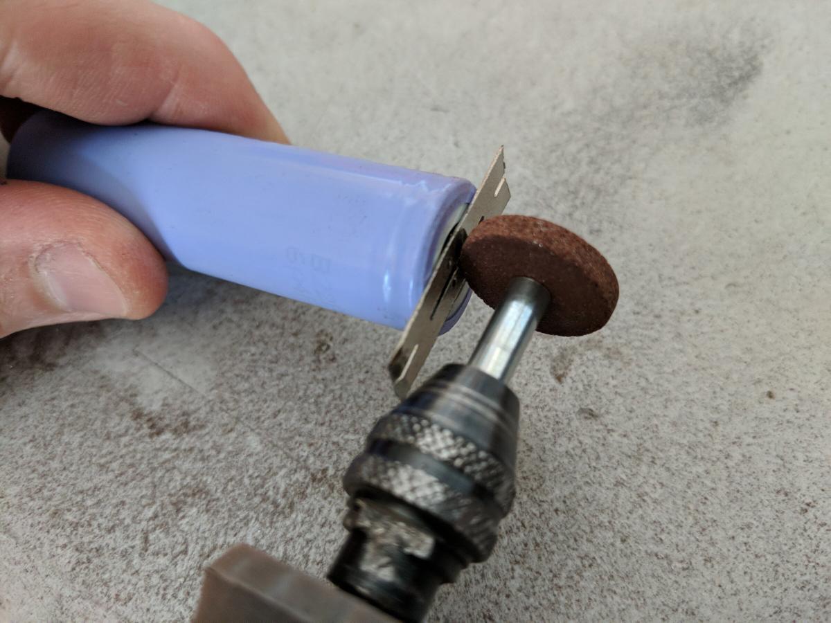 Die Zellen aus den Plastikhaltern zu bekommen war nicht ganz einfach. Die Metallstreifen sind vergleichsweise dick und an die einzelnen Zellen geschweißt und mussten an den Schweißnähten angeschliffen werden. Einfaches Abziehen hätte die Zelle zerstört.