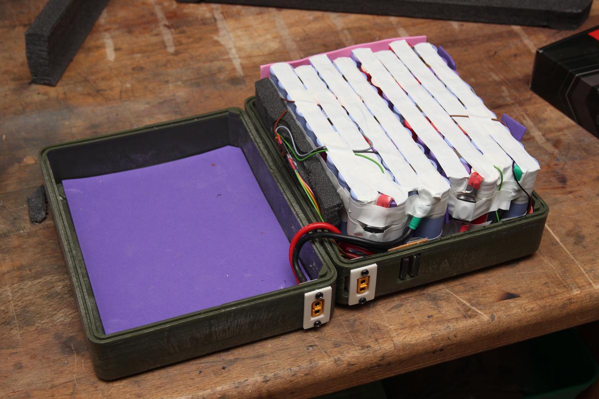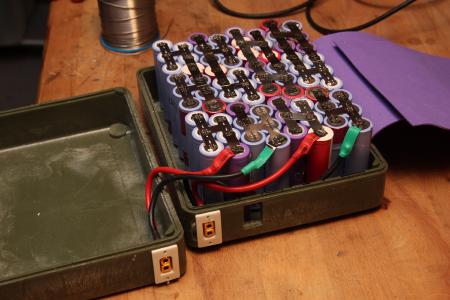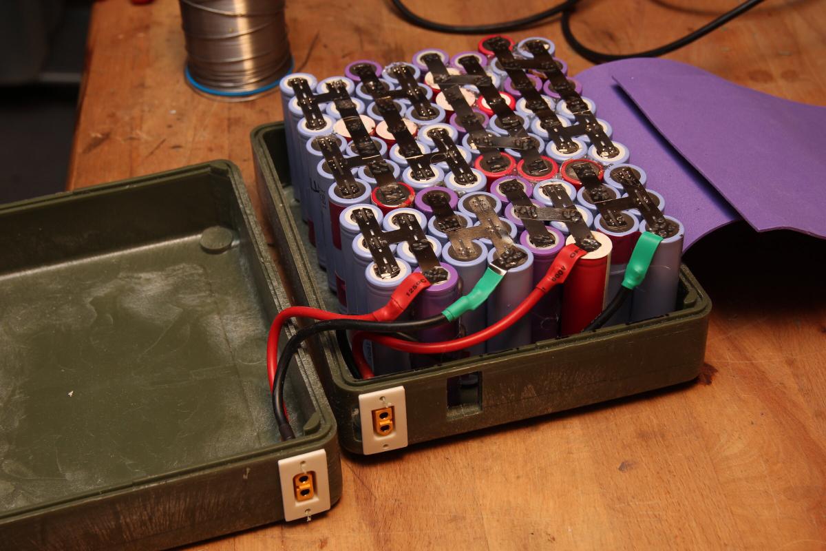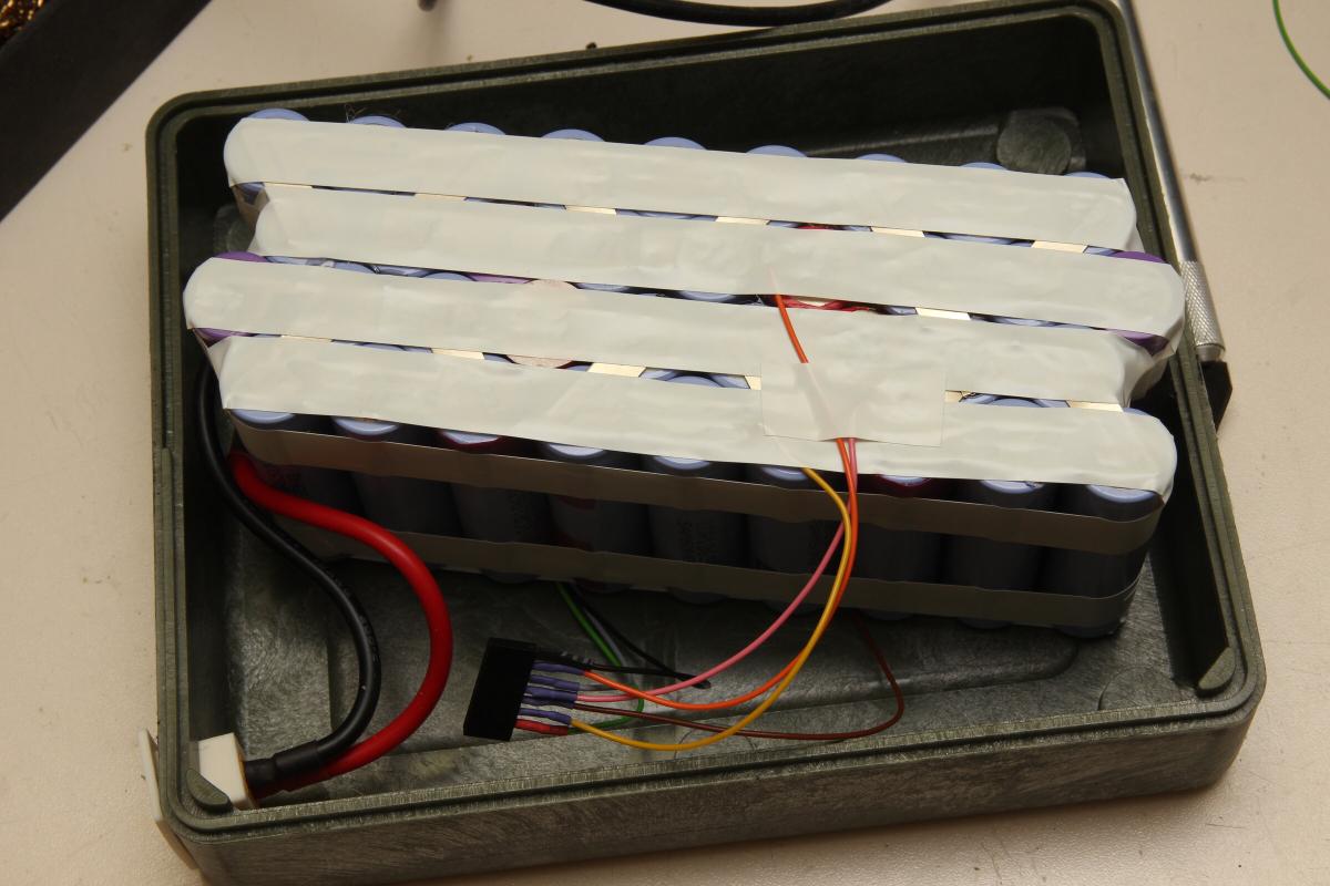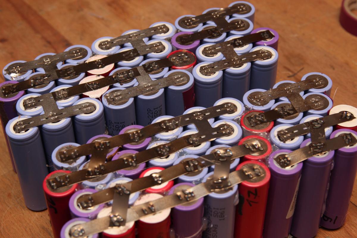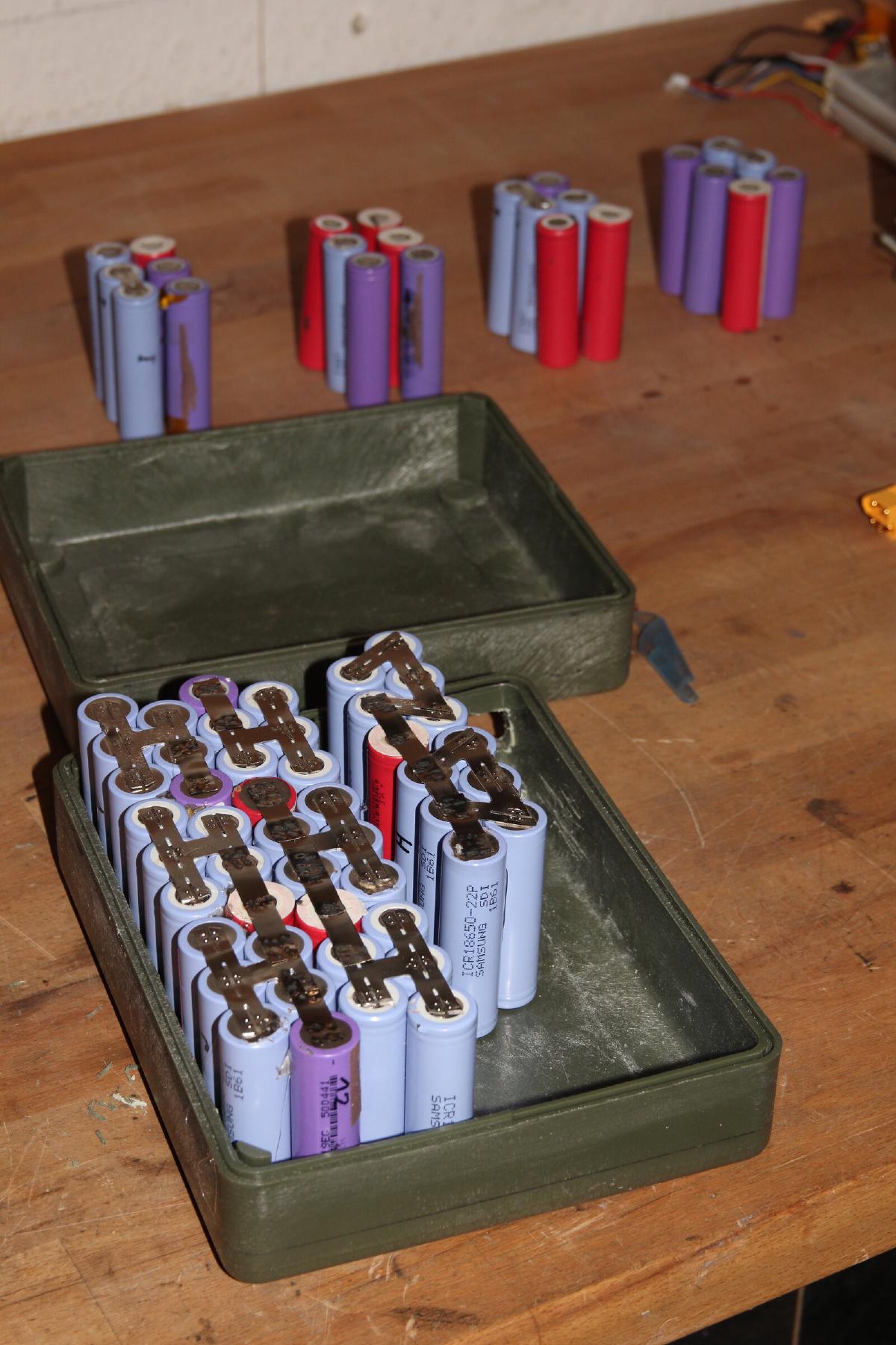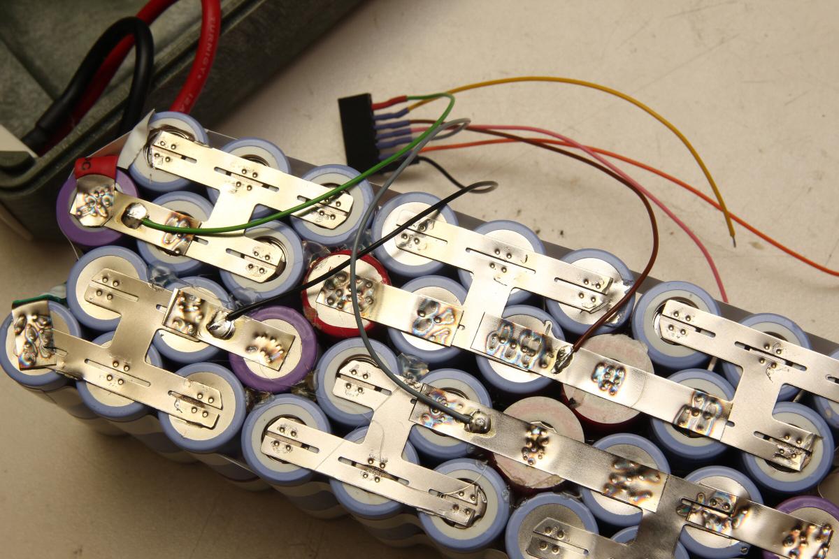 Acht von zehn parallel verschalteten Packs hab ich zusammen gelassen und für 6P jeweils eine weitere Zelle dazugeschweißt. Die fehlenden 22 Akkus kamen aus alten Laptopakkus. Jede dieser Zellen und jedes 5er Pack hab ich zuvor ausgemessen, sodass einerseits schlechte Akkus aussortiert werden konnten und ich mir vorher aber auch eine Zusammenstellung überlegen konnte, bei der sich das Pack später gleichmäßig entlädt.