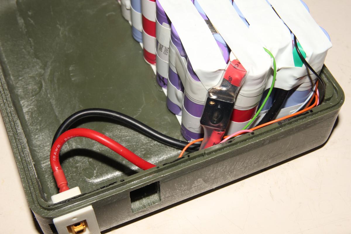 Da ich hierbei kein BMS verbaue müssen die einzelnen Zellenspannungen als Balanceranschluss herausgeführt werden. Als Anschluss ist ein XT60 Stecker in einem 3D gedruckten Einsatz in die Box eingelassen. Damit bei einem Kurzschluss außerhalb der Akkubox nicht gleich die Bude brennt, kam noch je 6S Pack eine 60A Mini ANL Sicherung dazu.