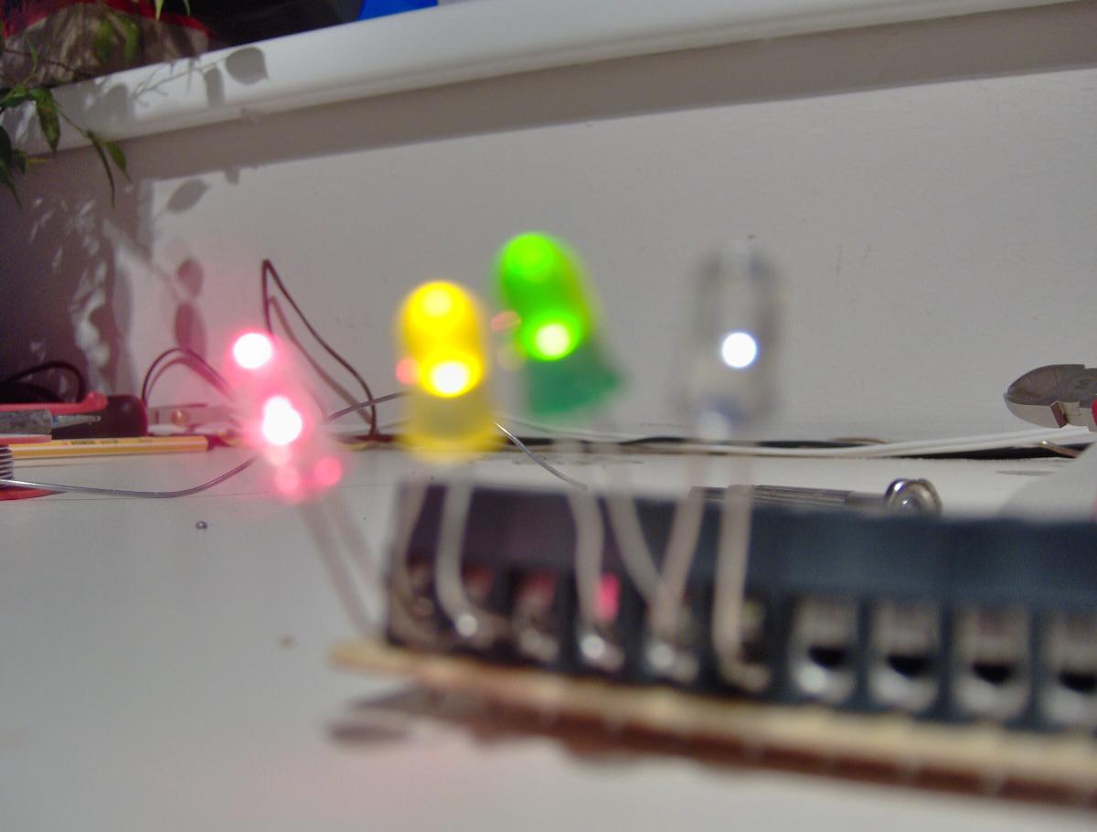 die Lichtsteuerung mit 4 LED´s am laufen. Die LED´s variieren bei jedem Beat.