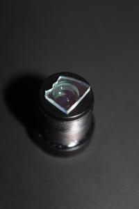 Das Objektiv kann nach dem Lösen einer kleinen Madenschraube herausgedreht werden, durch das drehen am Objektiv wird auch der Fokus eingestellt. Durch hereindrehen des Objektivs (rechtsrum) verschiebt sich der Fokus weiter weg.