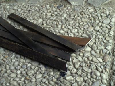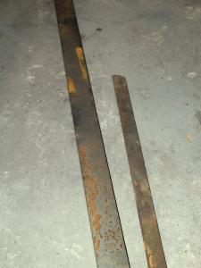Hier die rostigen Stahlstangen vom Schrottplatz. Aus der oberen (2cm breit) entsteht die Kugellagerhalterung.