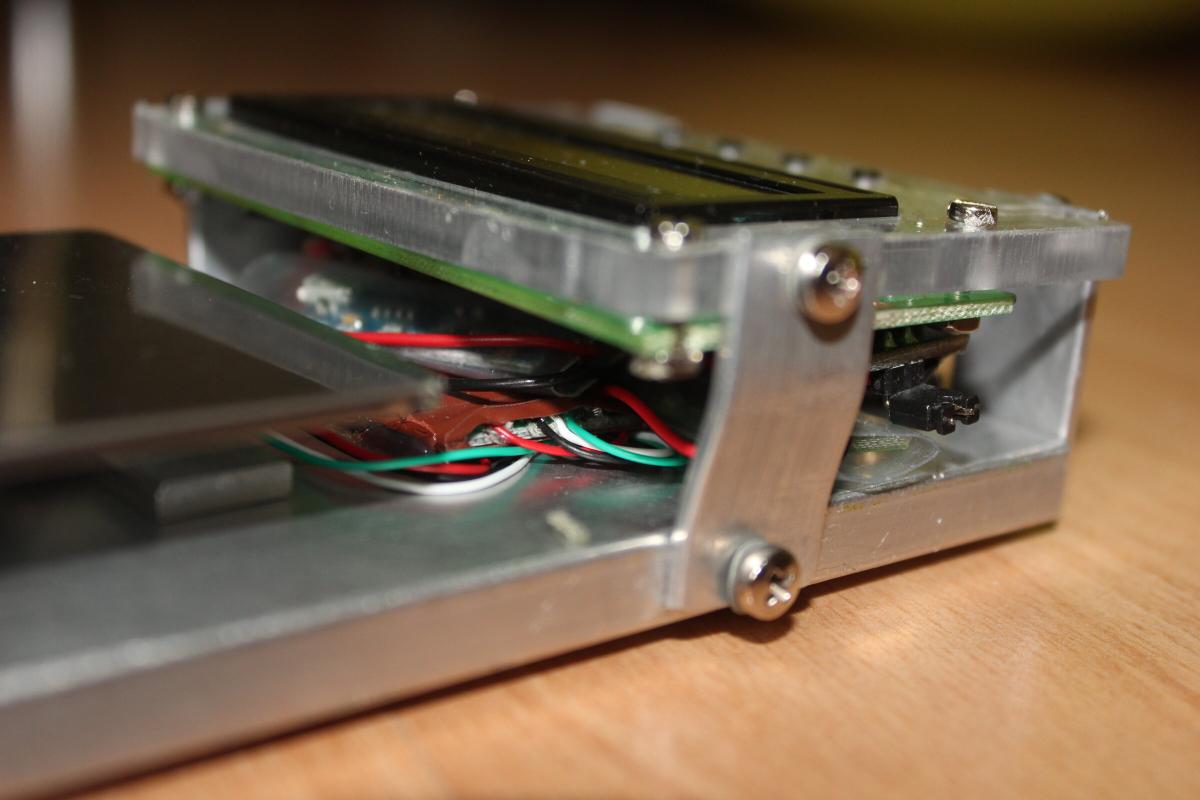 Hinter einer 5mm Acrylglasplatte liess es sich gut verschrauben. Da ich das Display nicht Parallel ansteuern möchte kam auf die Rückseite ein IIC/I2C/TWI/SPI Serial Interface Board Module Port 1602LCD Display-Dingsi.