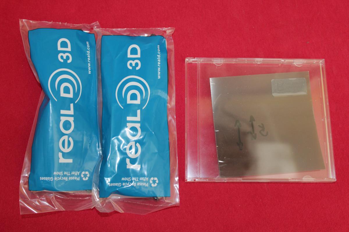 Die zwei 10cm x 10 cm zirkularen Polfilter hab ich bei realvision-3d für 30€ gekauft. Die zwei neuen RealD Brillen hab ich für je 1,19 gleich mitbestellt.