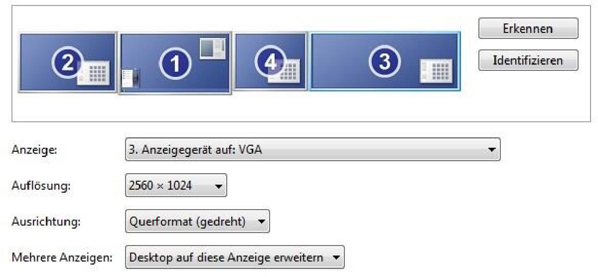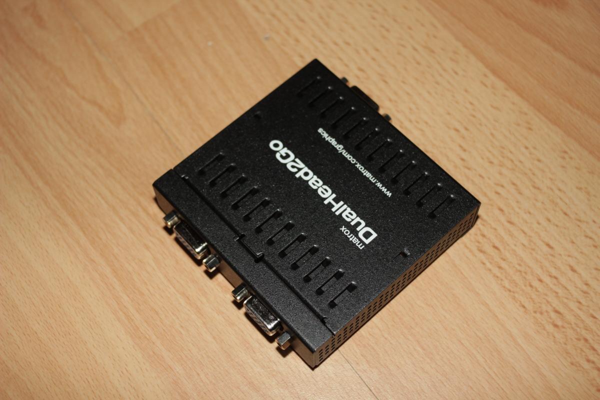 Um mehrere Monitore an einen Ausgang anzuschließ gibt es die Matrox DualHead2Go und TripleHead2Go Boxen. Dabei kostet die DualHead2Go (analog) neu ca. 150€. Ich hatte das Glück eine bei Ebay für 30€ zu bekommen.