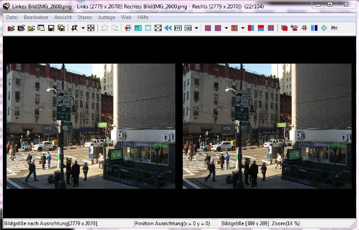 Also F7 drücken und kurz das Anaglyphenbild ohne Brille auf höhenfehler überprüfen (Objekte dürfen nur in der horizontalen verschoben sein). SPM hierbei am Besten vergrößern oder in den Vollbildmodus wechseln (Alt+Enter). Enthält das Bild solche Fehler oder ist anderweitig bei der Autojustage vermurkst worden kann man es entweder mit erneuter Autojustage Justage->“Automatische Bildjustage” (oder Alt+A) versuchen, oder aber man muss die Originalen links/rechts Bilder laden und manuell Ausrichten sofern einem das Foto wichtig ist.