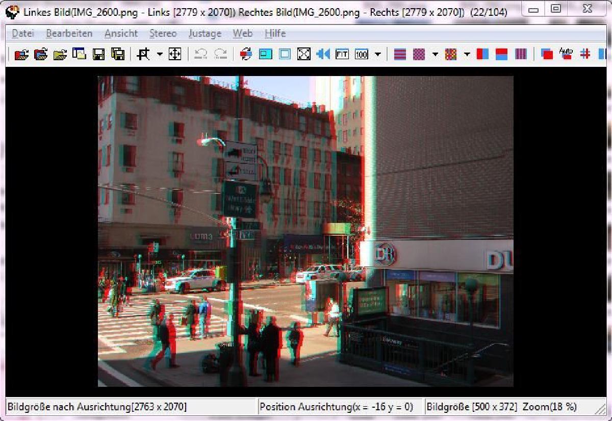 Um Stereobilder auszurichten arbeite ich gerne mit Rot/Cyan Anaglyphen, da hier die linken und rechten Halbbilder bei überlagerung gut zu unterscheiden sind. Das gewünschte Anaglyphenformat kann unter Stereo->Farbanaglyphen->… geändert werden. Mit F7 und F9 kann im folgenden schnell zwischen Anaglyph und SBS gewechselt werden, Anaglyphen zum Ausrichten und Probebetrachten, SBS zum finalen Speichern (oder beliebiges präferiertes Stereoformat).