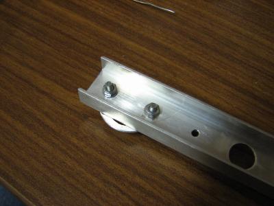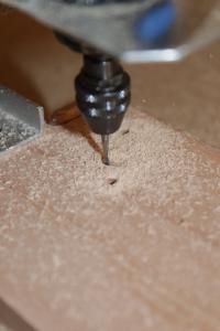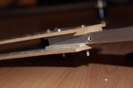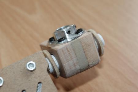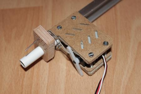 Das 10mm PVC Rohr wird durch zwei M3 Gewindeschrauben und zwischen zwei kleinen Holzstreifen am Ende des kürzeren Arms angeschraubt. Auf dem überstehenden Ende soll sich ein Holzklotz als Motorhalter frei drehen können