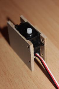 Hier sieht man auch nun, wie der Servo zwischen den zwei Platten (s.o.) durch zwei größere Hartfaserplatten (die mit dem Pfeilmuster), welche an dem Aluprofil angeschraubt sind, eingeklemmt wird.