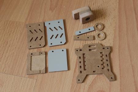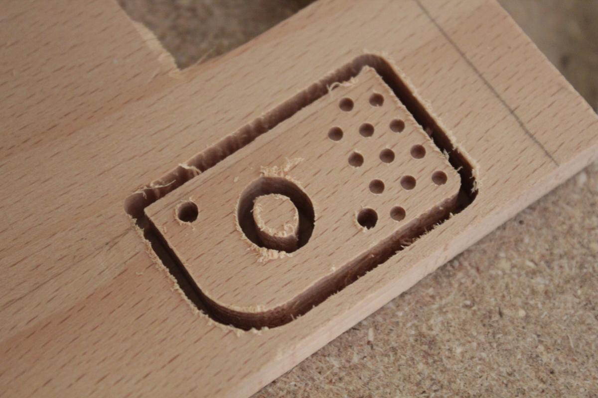 Nebenbei musste noch der drehbare Holzklotz hergestellt werden. Wieder einmal half mir die CNC mit der ich den Klotz, bestehend aus drei Teilen, aus zwei mal 10mm dickem Holz und einer 5mm dicken MDF Platte gefräst hab.
