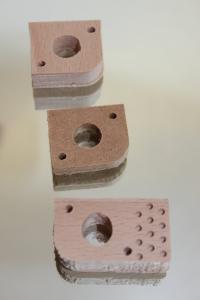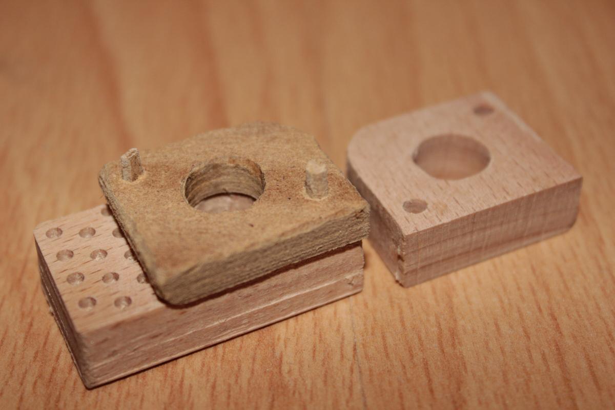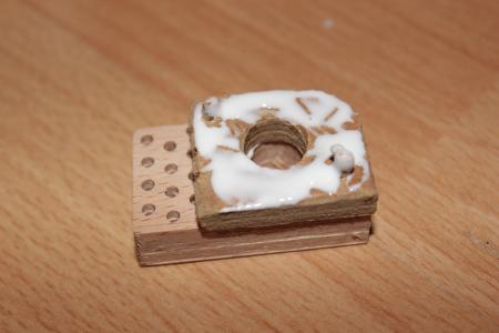 Diese hab ich dann zusammengeleimt. Durch die zwei kleinen Löcher neben dem großen Loch hab ich einen kleinen Holzstift gesteckt, welcher den Klotz zusätzlich gegen verdrehen schützen soll