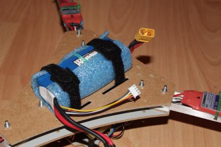 An die XT60 Buchse wird dann direkt der LiPo gesteckt, welcher mit zwei Kletthaltern an der Unterseite gehalten wird.