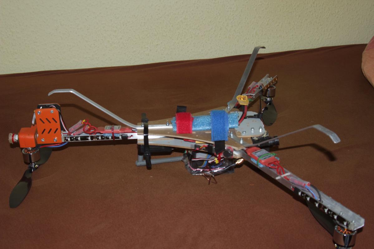 - Änderung: Anstelle der Landeringe befinden sich nun Landebeine aus Alu unter jedem Arm. Sie sind etwas leichter als die Ringe (ein Ring ca. 17 Gramm, eine 25cm Alustange etwa 12 Gramm). Viel wichtiger aber: Sie lassen den Copter bei härteren Landungen nicht so sehr hüpfen.