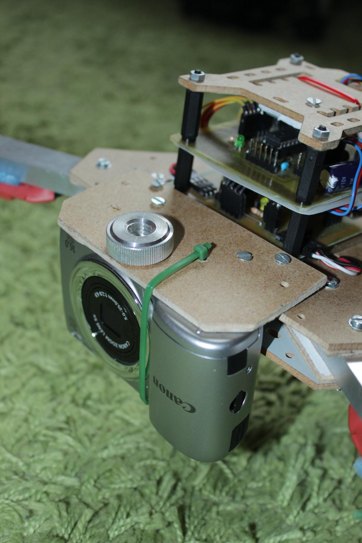 Da ich noch eine Canon A810 rumliegen hatte musste ich nurnoch eine simple Befestigung aus einem Holzstück (3mm dicke Hartfaserplatte) mit ein paar Löchern an der richtigen Stelle bauen.