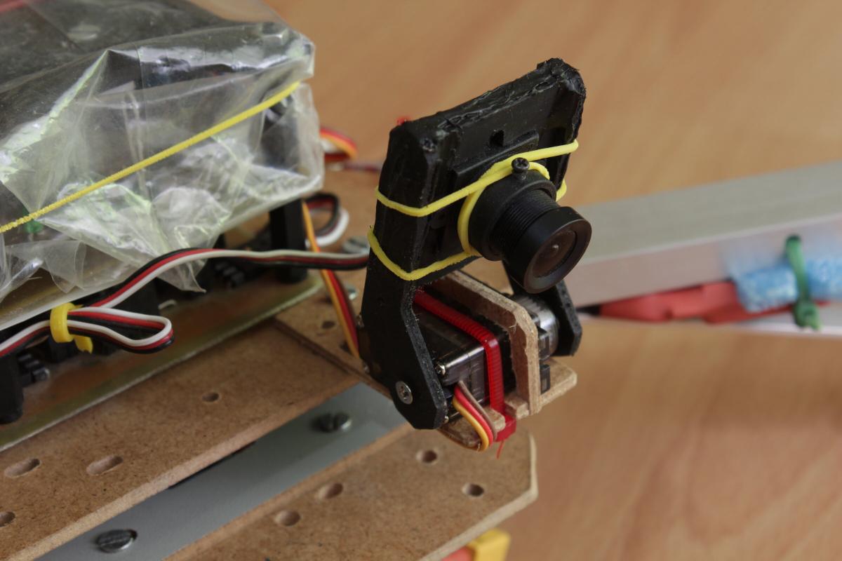 Der Servo ist mit Kabelbinder auf einer kleinen Holzplatte befestigt. Die verwendete Kamera ist eine FH18C von Foxtech.